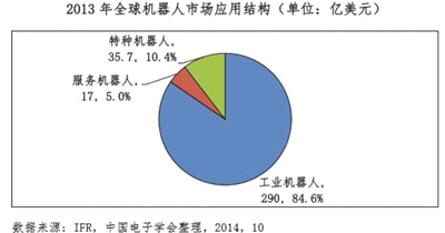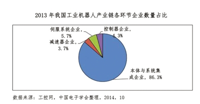 從產(chǎn)業(yè)現(xiàn)狀來看,全球機器人發(fā)展有四個特點:首先,全球市場快速增長,工業(yè)應(yīng)用獨占鰲頭。據(jù)國際機器人聯(lián)合會(IFR)統(tǒng)計,2013年全球機器人市場總規(guī)模達342.7億美元。其中,工業(yè)機器人市場規(guī)模約為290億美元,同比增長11.5%。其次,工業(yè)應(yīng)用逐步拓展,服務(wù)應(yīng)用漸成熱點。國外工業(yè)機器人企業(yè)的業(yè)務(wù)大多起源于汽車制造。近年來,工業(yè)機器人企業(yè)開始高度關(guān)注電子信息制造、食品加工、化工等傳統(tǒng)行業(yè)中的機器人應(yīng)用。機器人應(yīng)用也正從工業(yè)領(lǐng)域向國防軍事、醫(yī)療康復(fù)、助老助殘、家居服務(wù)等領(lǐng)域迅速拓展。其三,跨國企業(yè)優(yōu)勢明顯,大型企業(yè)發(fā)展全面。目前,跨國企業(yè)在核心零部件、整機、系統(tǒng)集成等機器人產(chǎn)業(yè)鏈的各個環(huán)節(jié)均有明顯優(yōu)勢。例如在減速器領(lǐng)域,應(yīng)用于工業(yè)關(guān)節(jié)機器人中的諧波減速器基本被日本哈默納科一家公司壟斷。在工業(yè)機器人整機領(lǐng)域,發(fā)那科、庫卡、ABB、安川四大企業(yè)是全球市場的絕對強者。第四,互聯(lián)網(wǎng)企業(yè)頻發(fā)力,機器人技術(shù)助發(fā)展。近兩年,國際互聯(lián)網(wǎng)企業(yè)大舉進軍機器人領(lǐng)域。以谷歌為例,2013年收購了8家機器人企業(yè),2014年初又收購了人工智能公司DeepMind和智能家居公司Nest。谷歌還持續(xù)研發(fā)無人駕駛汽車,并取得較大進展。虛擬業(yè)務(wù)與現(xiàn)實業(yè)務(wù)相結(jié)合,是谷歌獲取持久發(fā)展力的重要途徑。