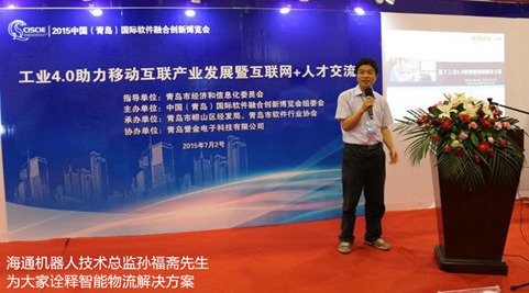 7月3日下午,青島海通機器人系統(tǒng)有限公司“海通基于工業(yè)4.0的智能物流解決方案”的發(fā)布會暨推介會在軟博會上成功發(fā)布,海通機器人技術(shù)總監(jiān)孫福齋先生在推介會上為到場的新聞媒體、相關(guān)行業(yè)權(quán)威專家及廣大用戶詮釋了海通自主研發(fā)的智能物流解決方案。孫總表示,海通以慣性導航iAGV機器人為基礎,結(jié)合中國現(xiàn)階段的物流系統(tǒng)的實際情況,融入工業(yè)4.0模型,利用公司自身強大的算法、軟件實力,創(chuàng)造性的建立起一個全新的、標準化的智能物流解決方案,成功的實現(xiàn)了物流系統(tǒng)的物聯(lián)化、信息化和智能化,使得海通智能物流方案能夠與其他外部系統(tǒng)等無縫對接。這也是國內(nèi)第一個基于AGV和工業(yè)4.0概念的智能物流模型。