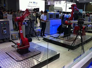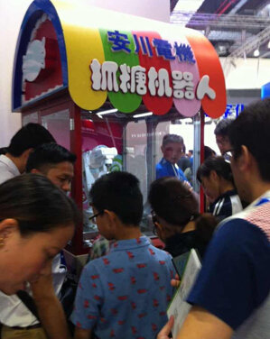 圖為七軸安川機器人焊接系統(tǒng)。抓糖機器人和酒吧料理機器人引來眾多小朋友的關(guān)注。