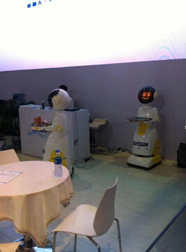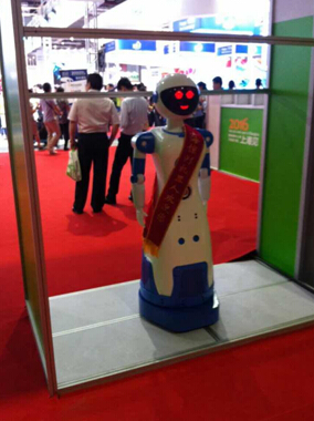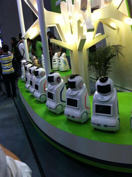圖為展會中隨處可見的迎賓,發(fā)送傳單等服務(wù)型機器人。