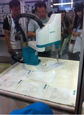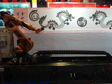 圖為廣州數(shù)控新一代推出的“赤金龍”系列機器人,結(jié)合離線編程技術(shù)繪制4米的龍紋圖案,展示了赤金龍系列機器人優(yōu)秀的7軸聯(lián)動控制的性能、機器人高精軌跡精度和重復(fù)定位精度,在復(fù)雜工作途徑的運動性能和穩(wěn)定性。