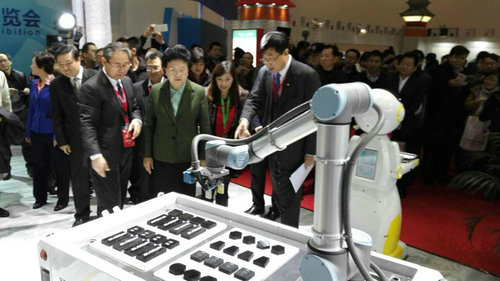 新松機(jī)器人公司總裁曲道奎向國務(wù)院副總理劉延?xùn)|介紹復(fù)合型機(jī)器人產(chǎn)品