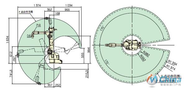 下圖以松下焊接機器人TA-1400為例說明工作空間:綠色部分即手腕上機械接口坐標系的原點在空間能達到的范圍。