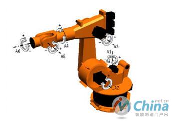 工業(yè)機器人在運動方式上,總可以分為直線運動(簡記為P)和旋轉運動(簡記為R)兩種,應用簡記符號P和R可以表示操作機運動自由度的特點,如RPRR表示機器人操作機具有四個自由度,從基座開始到臂端,關節(jié)運動的方式依次為旋轉-直線-旋轉-旋轉。此外,工業(yè)機器人的運動自由度還有運動范圍的限制。下圖為具有6個旋轉自由度的串聯(lián)機器人。