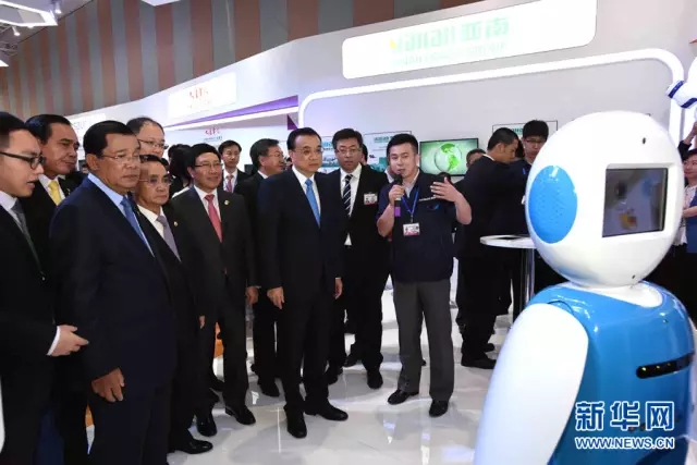 在新松機(jī)器人展位,李克強(qiáng)同五國領(lǐng)導(dǎo)人參觀了新松公司銀行助理機(jī)器人、7軸柔性多關(guān)節(jié)機(jī)器人在內(nèi)的最新研發(fā)產(chǎn)品,詳細(xì)聽取了技術(shù)人員關(guān)于產(chǎn)品技術(shù)特點(diǎn)、研發(fā)背景、市場(chǎng)應(yīng)用情況的講解。