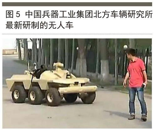 我國(guó)在軍用無(wú)人車輛方面的研發(fā)尚處起步階段。2015年,中國(guó)兵器工業(yè)集團(tuán)北方車輛研究所成立的地面無(wú)人平臺(tái)研發(fā)中心,展示了其最新研制的軍用無(wú)人車輛(圖5),其采用6×6分布式輪轂電機(jī)驅(qū)動(dòng)形式,可實(shí)現(xiàn)零半徑速差轉(zhuǎn)向。據(jù)報(bào)道,該車具有單兵跟蹤的能力,可攜帶物資隨隊(duì)行軍,此外該車輛還可搭載專門的探測(cè)設(shè)備,以輔助士兵完成偵察等任務(wù)。