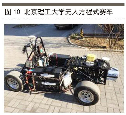 上述機(jī)構(gòu)的研究主要關(guān)注于感知、定位與導(dǎo)航,但仍有部分學(xué)者關(guān)注于如何在現(xiàn)有感知技術(shù)條件下發(fā)揮無(wú)人車輛的動(dòng)力學(xué)極限,以實(shí)現(xiàn)大幅提高無(wú)人車輛的行駛速度。因此,無(wú)人賽車便成為國(guó)內(nèi)外諸多頂尖學(xué)者的關(guān)注方向。比較具有代表性的有斯坦福大學(xué)的動(dòng)力學(xué)設(shè)計(jì)實(shí)驗(yàn)室,在現(xiàn)有成熟的環(huán)境感知技術(shù)條件下,實(shí)現(xiàn)給定路徑下控制車輛發(fā)揮動(dòng)力學(xué)性能極限。目前,斯坦福大學(xué)的奧迪無(wú)人賽車(圖9)已經(jīng)在賽道上實(shí)現(xiàn)了駕駛速度超過(guò)一般水平的賽車手。在國(guó)內(nèi),北京理工大學(xué)無(wú)人賽車研究團(tuán)隊(duì)已研制出純電力驅(qū)動(dòng)的小型無(wú)人方程式賽車(圖10)。