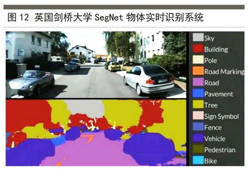 機(jī)器視覺(jué)采用攝影機(jī)和電腦代替人眼的方式,對(duì)目標(biāo)進(jìn)行識(shí)別、跟蹤和測(cè)量。在無(wú)人車輛上,通過(guò)機(jī)器視覺(jué)應(yīng)用,可解釋交通信號(hào)、交通圖案、道路標(biāo)識(shí)等環(huán)境語(yǔ)言。與其它傳感器相比,機(jī)器視覺(jué)具有檢測(cè)信息大、價(jià)格相對(duì)低廉等優(yōu)點(diǎn);但在復(fù)雜環(huán)境下,要將探測(cè)的目標(biāo)與背景提取出來(lái),具有圖像計(jì)算量大、算法不易實(shí)現(xiàn)等缺點(diǎn)。機(jī)器視覺(jué)又分為單目視覺(jué)、全景視覺(jué)和立體視覺(jué)。圖12展示的就是基于深度學(xué)習(xí)的英國(guó)劍橋大學(xué)SegNet物體實(shí)時(shí)識(shí)別系統(tǒng)。