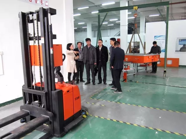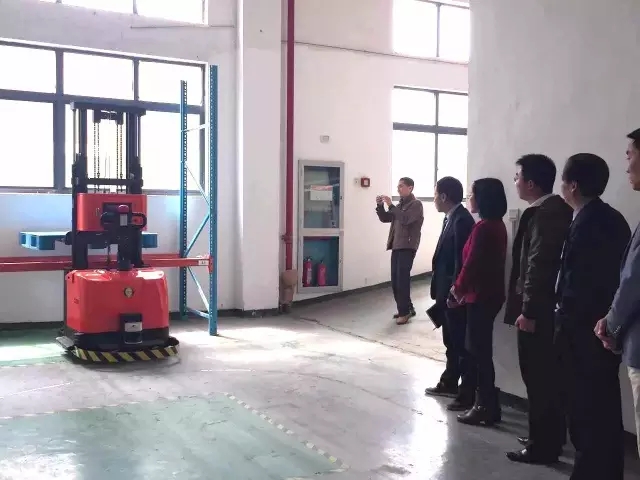 (許局一行觀(guān)看艾吉威無(wú)反光板激光自主導(dǎo)航叉車(chē)AGV演示)