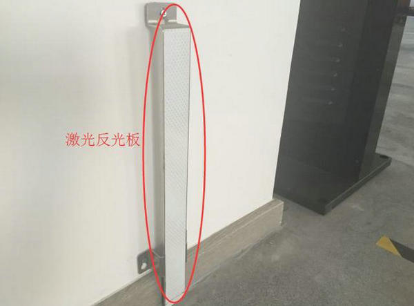 在公司的測(cè)試車庫中,墻壁上每隔幾米就安裝了一個(gè)激光反光板,整個(gè)車庫大概有20-30個(gè)的樣子,而激光雷達(dá)在每輛AGV的最前端。