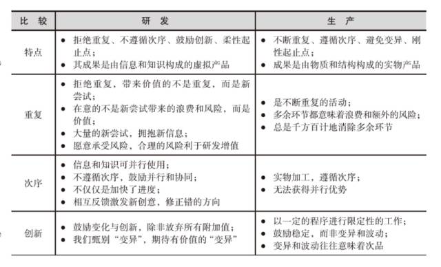 我們通過研發(fā)和生產(chǎn)的比較來說明這種差異。生產(chǎn)的總體特征是:不斷重復(fù)、遵循次序、避免變異、具有剛性起止點(diǎn),其成果是由物質(zhì)和結(jié)構(gòu)構(gòu)成的實(shí)物產(chǎn)品。