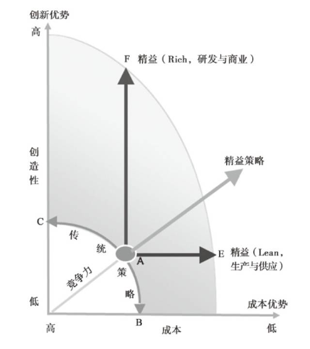 精益研發(fā)和精益商業(yè)策略則是關(guān)注創(chuàng)新的策略(沿著AF射線垂直行進(jìn))。該策略在不顯著增加成本的前提下,可以提高產(chǎn)品的品質(zhì)、技術(shù)含量和品牌價(jià)值,從而提升產(chǎn)品的附加值,達(dá)到增加競(jìng)爭(zhēng)力的目的。采用這種策略,可以比同類產(chǎn)品賣得更貴,但仍然有人買,這就是精良設(shè)備和名牌產(chǎn)品。