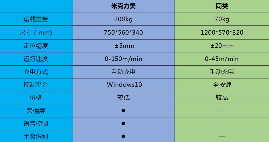 米克力美激光導(dǎo)航AGV小車使用激光掃描全自動(dòng)規(guī)劃路徑,能夠自動(dòng)識別所在電梯、房間、通道的位置,實(shí)時(shí)構(gòu)建地圖進(jìn)行導(dǎo)航,是全球唯一解決機(jī)器人跨樓層的地圖識別。在行駛過程中能夠自動(dòng)避讓人和障礙物實(shí)現(xiàn)360°旋轉(zhuǎn),極大提高了自動(dòng)化生產(chǎn)的安全性。和國內(nèi)其他同類激光AGV產(chǎn)品相比,在運(yùn)載重量、尺寸、定位精度、運(yùn)行速度、充電方式、控制平臺(tái)、價(jià)格、跨樓層、語音控制以及手勢識別等方面,有著不可逾越的優(yōu)勢: