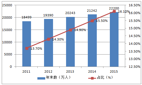 2011-2015年中國60歲以上人口數(shù)量變化情況