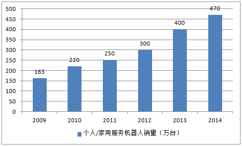 據(jù)統(tǒng)計(jì),2012年全球個(gè)人/家用服務(wù)機(jī)器人銷量約為300萬臺(tái),較2011年增長20%,銷售額為12.21億美元;2014年全球個(gè)人/家用服務(wù)機(jī)器人銷量約為470萬臺(tái),較2013年增長17.50%,銷售額約為22.5億美元。
