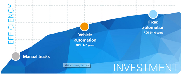 在投資方面,AGV所帶來的效率提升回報要遠高于其相關(guān)投入。并且,由于總的日常運營成本低,包括預(yù)防性維護成本和修理成本都有所減少,AGV的投資回報周期通暢是1-2年。