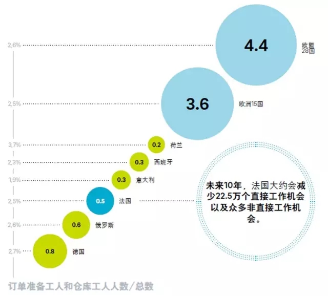 雖然物流業(yè)機器人化仍處于起步階段,但是其巨大潛力使物流業(yè)重新思考幾十年來的固有工作組織模式。若無任何過渡性準(zhǔn)備,未來十年,將機器人應(yīng)用于物流業(yè)將直接導(dǎo)致成千上萬的非技術(shù)性工作崗位消失,歐元區(qū)將消失150萬個工作崗位,其中最受影響的領(lǐng)域?qū)⑹桥渌?、制造業(yè)和外包的物流服務(wù)公司。