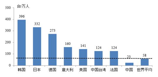相對(duì)德、日、韓等國(guó)而言,我國(guó)機(jī)器人密度還是很低,2012年我國(guó)制造業(yè)中每萬(wàn)人工業(yè)機(jī)器人擁有量?jī)H為23臺(tái),遠(yuǎn)低于世界平均的每萬(wàn)人58臺(tái)。即使剔除不可比因素,我國(guó)機(jī)器人密度還存在較大的提升空間,工業(yè)機(jī)器人市場(chǎng)潛力巨大。2015年,我國(guó)工業(yè)機(jī)器人市場(chǎng)需求量達(dá)到7.5萬(wàn)臺(tái),保有量達(dá)到26.6萬(wàn)臺(tái)。預(yù)計(jì)到2020年,我國(guó)工業(yè)機(jī)器人市場(chǎng)需求量將達(dá)到15萬(wàn)臺(tái),保有量達(dá)到80萬(wàn)臺(tái)。到2025年,我國(guó)工業(yè)機(jī)器人市場(chǎng)需求量將達(dá)到26萬(wàn)臺(tái),保有量達(dá)到180萬(wàn)臺(tái)。