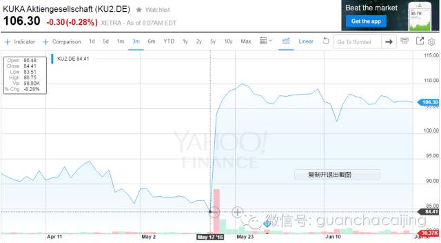 觀察者網(wǎng)此前曾報(bào)道,5月18日美的集團(tuán)公告稱,公司意圖以每股115歐元,將對(duì)庫(kù)卡的持股比例從13.5%提升至30%以上。而在今年2月,美的宣布增持庫(kù)卡股份至10.2%的時(shí)候,庫(kù)卡的股價(jià)還只有72歐元。這也就意味著,美的此番的收購(gòu)溢價(jià)竟接近60%,可以說(shuō)是頗為慷慨。