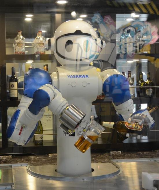 圖說:在第26屆青島國際啤酒節(jié)上,智能啤酒機器人的亮相引人注目,它既可幫游客打散裝啤酒,亦可打開瓶裝啤酒為游客斟酒。 新華社記者 張旭東 攝
