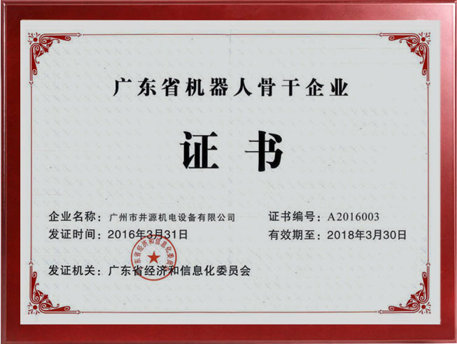 近日,我公司正式收到了廣東省經(jīng)信委頒發(fā)的“廣東省機(jī)器人骨干企業(yè)”證書(shū)。2016年3月22日,廣東省經(jīng)信委公布了廣東省首批機(jī)器人骨干企業(yè)名單,廣州市井源機(jī)電設(shè)備有限公司榜上有名。