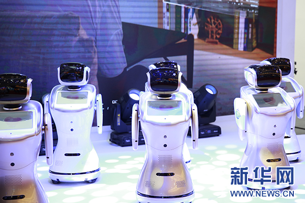 展區(qū)內的一款平臺機器人應用終端,可提供不同的定制化智能服務。(新華網 魯聃玉文攝)