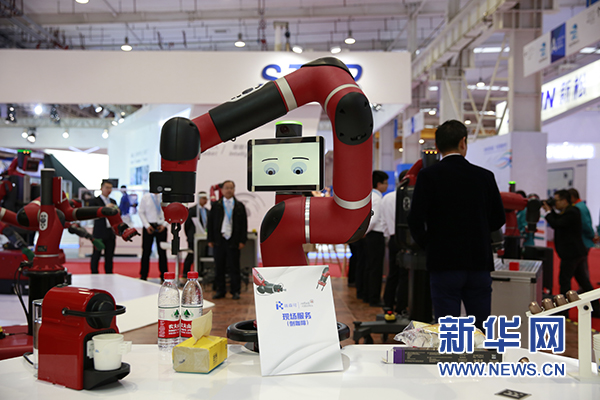 展區(qū)內,一款智能協(xié)作機器人在展示沖泡咖啡服務。(新華網 魯聃玉文攝)