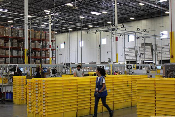 我們參觀的是亞馬遜最先進(jìn)的一代(第八代)配送運營中心,位于加州奧克蘭以東約60英里的Tracy市,該中心成立于2013年,占地面積約10萬平方米,存儲能力相當(dāng)于25萬平方米的普通倉庫,約有2000名工人在這里工作。該運營中心目前管理、存儲了數(shù)百萬貨品。亞馬遜在全美各地共擁有10個第八代運營中心,每天處理的訂單量為幾十萬級。