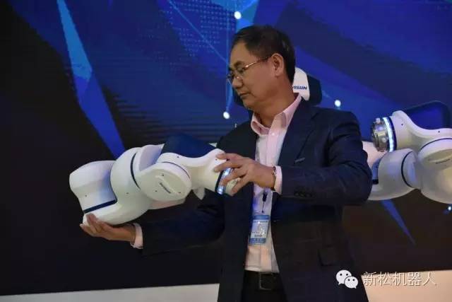 新松公司總裁曲道奎向媒體展示雙臂協(xié)作機(jī)器人操作