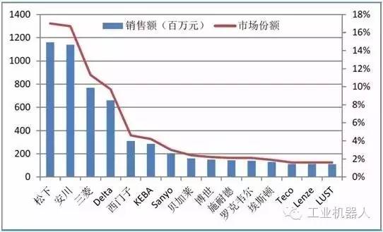 圖表3:2014年中國(guó)伺服系統(tǒng)前15名市場(chǎng)份額及銷售額