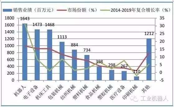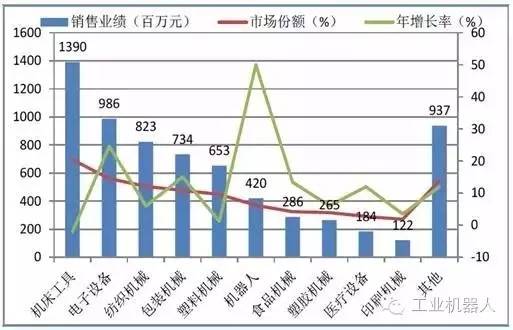 從市場(chǎng)規(guī)模來(lái)看,2014年伺服電機(jī)在所有應(yīng)用行業(yè)規(guī)模68億人民幣,增速為8.3%;其中機(jī)器人增速高達(dá)50%,迅速成長(zhǎng)為伺服系統(tǒng)應(yīng)用中排名第六的行業(yè),以4.2億的業(yè)績(jī),占市場(chǎng)份額6.2%。