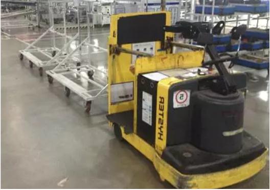 裝有金屬骨架的臺車由小火車拖運(yùn),每次拖運(yùn)高達(dá)6節(jié)車廂。拖運(yùn)途中不僅會因?yàn)閿[動造成交通隱患,更因?yàn)榻饘倭霞芘_車彼此的碰撞產(chǎn)生了較大的噪音。此外,線邊臺車擺放混亂,影響美觀。