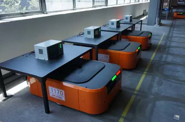 馬路創(chuàng)新有一套自主研發(fā)的倉(cāng)儲(chǔ)系統(tǒng),由多臺(tái)AGV小車(chē)聯(lián)動(dòng)構(gòu)成。AGV小車(chē)的功能是根據(jù)軟件系統(tǒng)指令將指定貨架運(yùn)送至指定工作臺(tái),工作臺(tái)完成揀選后再將貨架送回軟件系統(tǒng)指定的位置。