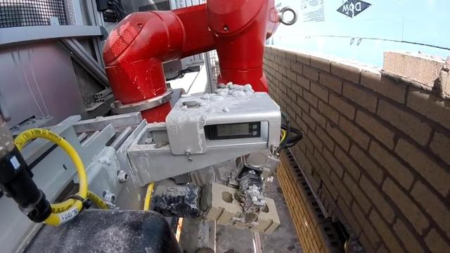 由于是半自動(dòng)的,因此整套系統(tǒng)運(yùn)作時(shí)還需要兩位工人幫忙,一位負(fù)責(zé)將磚塊放上傳送帶,隨后由噴嘴抹上水泥的磚塊會(huì)被機(jī)械臂拿起并砌在相應(yīng)部位,第二位工人則負(fù)責(zé)抹掉墻上多余的水泥。