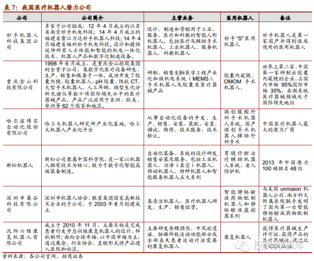 隨著醫(yī)用機(jī)器人技術(shù)的不斷突破和發(fā)展,從2005年開始我國有一批重點(diǎn)高??蒲嗅t(yī)院單位及研究所在研究醫(yī)用機(jī)器人系統(tǒng)并取得了一些小成就,比如哈工大的微創(chuàng)腹腔外科手術(shù)機(jī)器已經(jīng)成功被專家驗(yàn)收,天津大學(xué)的妙手機(jī)器人在今年3月份開始臨床使用;同時,隨著醫(yī)用機(jī)器人商業(yè)化市場化的可能性愈發(fā)明晰,已經(jīng)有部分企業(yè)正在生產(chǎn)或者打算進(jìn)軍醫(yī)用機(jī)器人細(xì)分行業(yè),其中就包括機(jī)器人領(lǐng)先企業(yè)的博實(shí)股份和新松機(jī)器人。