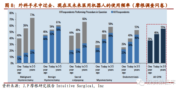 直覺外科公司微創(chuàng)機(jī)器人輔助手術(shù)機(jī)器人的領(lǐng)先者,其機(jī)器人系統(tǒng)在各類外科手術(shù)中的市場份額呈階度分布,在復(fù)雜手術(shù)中的地位領(lǐng)先。隨著直覺外科公司在科研技術(shù)方面的繼續(xù)投入和發(fā)展,可預(yù)期直覺外科在相當(dāng)一段時間內(nèi)會保持領(lǐng)先的競爭優(yōu)勢。