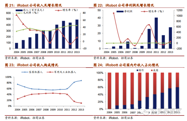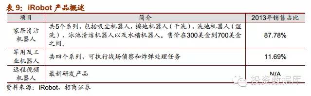 iRobot是家居清潔機器人的領(lǐng)先企業(yè),產(chǎn)品戰(zhàn)略布局以家居清潔機器人為主。2014年上半年實現(xiàn)營收2.54億美元,2013年收入達4.87億美元,全球市場占有率超過60%,2014年8月總市值為10.10億美元。