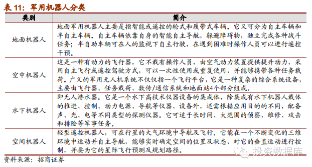 按照使用環(huán)境和軍事用途來分類,軍事機器人大分類:地面軍用機器人、空中機器人、水下機器人和空間機器人。