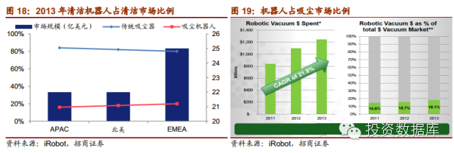 掃地機器市場具有巨大的潛力,增長勢頭強勁。13年家庭掃地機器人市場規(guī)模大于12億美元,過去三年復(fù)合增長率達21.8%。掃地機器人對傳統(tǒng)掃地設(shè)備的替代率不斷提高,13年占掃地設(shè)備市場18.1%。