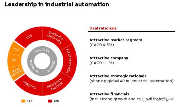 收購B&R(Bernecker + Rainer Industrie-Elektronik GmbH)將彌補(bǔ)ABB在機(jī)器和工廠自動化的歷史差距,將創(chuàng)建一個獨(dú)特的全球綜合自動化解決方案供應(yīng)商。ABB明確承諾繼續(xù)保持B&R增長故事,中期銷售目標(biāo)超過10億美元(現(xiàn)在為6億美元)。為保證管理的連續(xù)性,B&R創(chuàng)始人Josef Rainer和Erwin Bernecker在合并初期將擔(dān)任顧問,B&R奧地利Eggelsberg總部,將成為ABB機(jī)器和工廠自動化的全球中心,B&R將成為ABB工業(yè)自動化部門的一部分,作為一個新的全球業(yè)務(wù)單元-機(jī)器和工廠自動化單元,由B&R現(xiàn)任董事總經(jīng)理Hans Wimmer領(lǐng)導(dǎo)。此次購買價格沒有透露,大體上符合同行的估值。兩家公司的整合將把秉持增長和生活“兩全其美”的原則,ABB分階段把自己原有的PLC和伺服驅(qū)動產(chǎn)品加入到新的業(yè)務(wù)單元ABB致力于進(jìn)一步投資于B&R的業(yè)務(wù)擴(kuò)展,并建立公司成功的商業(yè)模式和品牌(筆者預(yù)計(jì)B&R品牌將會得到保留),B&R的軟件和物聯(lián)網(wǎng)解決方案將進(jìn)一步加強(qiáng)ABB提供數(shù)字化技術(shù)和產(chǎn)品的能力。
