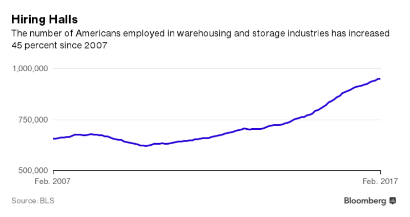 美國(guó)勞工統(tǒng)計(jì)局提供了一份關(guān)于美國(guó)倉(cāng)儲(chǔ)行業(yè)的數(shù)據(jù),美國(guó)二月份在倉(cāng)儲(chǔ)行業(yè)工作的共有939000名工人,比過去10年上漲了44%,電商的興起需要更多工人進(jìn)行配貨包裝。位于西雅圖的亞馬遜所提供的快速配送服務(wù),讓更多客戶對(duì)于配送時(shí)間的期望越來越高,倉(cāng)庫(kù)的繁榮吸引了越來越多的零售商向配送中心聚集,從而可以離他們的客戶更近一些。