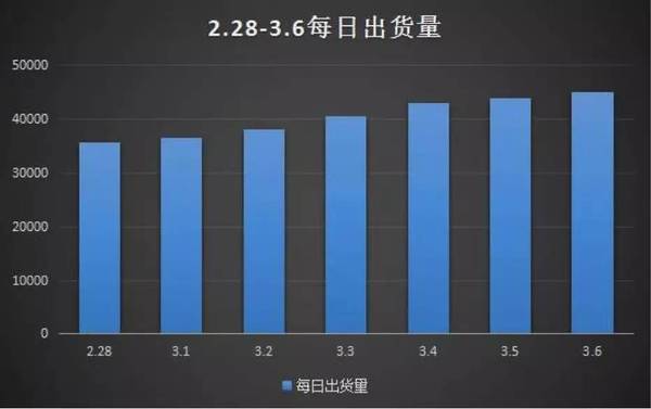 唯品會(huì)大促從2.28開始到3.6結(jié)束,日出貨量平穩(wěn)增長,從2.28的日出貨量3.5萬逐步增加到3.6的日出貨量4.5萬。