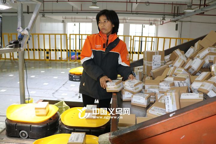 一走進(jìn)義烏申通智能機(jī)器人分揀系統(tǒng)倉(cāng)庫(kù),就看到一群類(lèi)似掃地機(jī)器人的機(jī)器在臺(tái)面上來(lái)回移動(dòng)。不同的是,每個(gè)機(jī)器“頭頂”黃色小托盤(pán),托盤(pán)內(nèi)載著快件。臺(tái)面上有一個(gè)個(gè)格口,格口按地域劃分。每次到達(dá)指定格口,機(jī)器人的托盤(pán)翻起,快件順著格口滑槽落入樓下的編織袋中,由人工進(jìn)行打包。