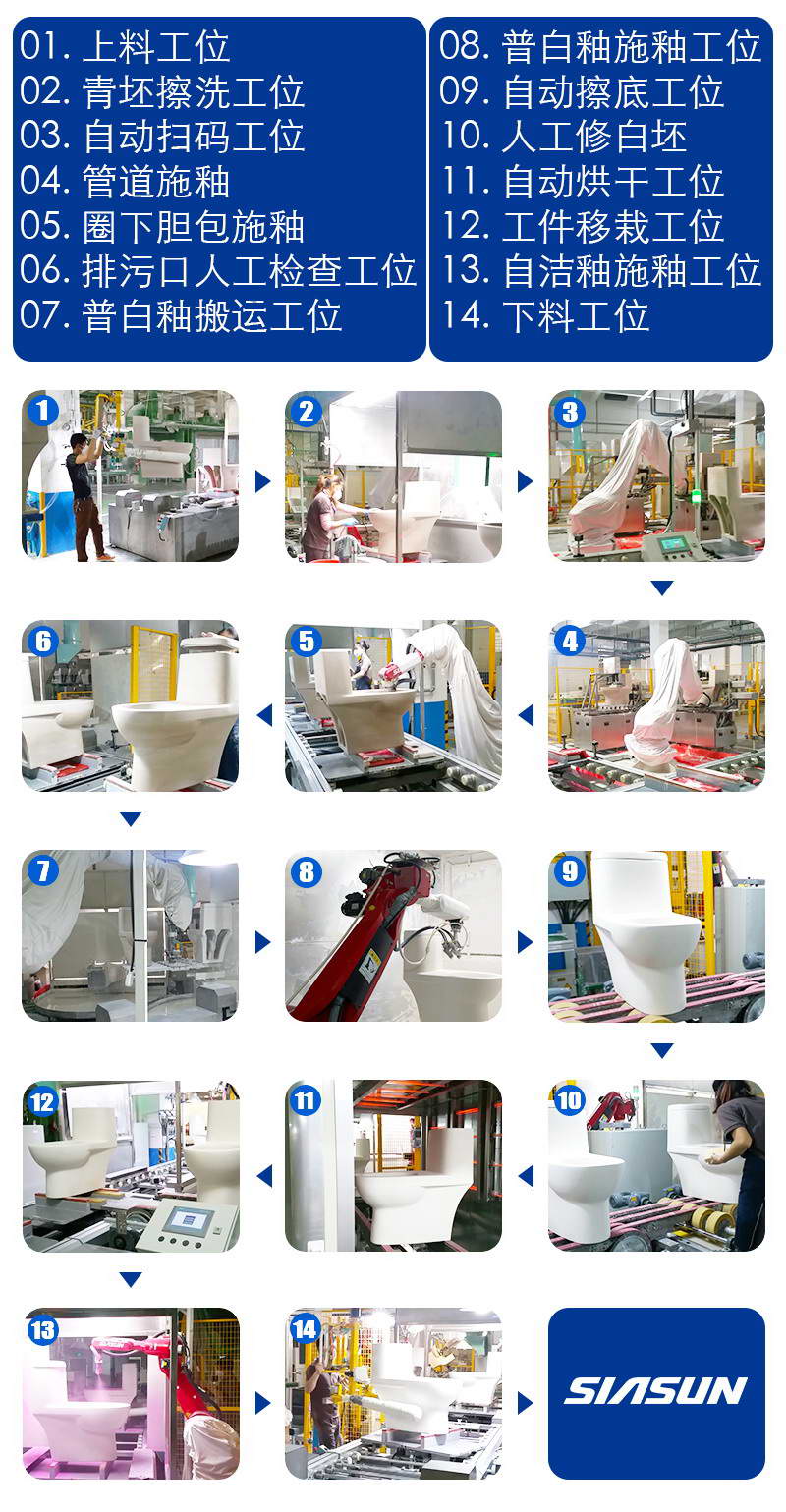 為解決用戶在施釉生產(chǎn)工藝中遇到的難題,新松公司對(duì)客戶現(xiàn)場(chǎng)進(jìn)行了大量的前期調(diào)研和分析,針對(duì)原有工藝流程特點(diǎn),開發(fā)了機(jī)器人施釉專家系統(tǒng)。該系統(tǒng)憑借整體化、參數(shù)化、專業(yè)化的優(yōu)異性能保證整條產(chǎn)線各工位之間分工協(xié)作,可完成從馬桶青坯來料至上釉全工序完成后下料的全流程自動(dòng)化生產(chǎn);線體涵概掃碼識(shí)別、灌釉、普白施釉、自潔釉施釉、檢測(cè)清理等十幾個(gè)工序,各單元設(shè)備與各工位接口的設(shè)計(jì)精細(xì)嚴(yán)謹(jǐn),可保證產(chǎn)線穩(wěn)定、持久、高效的自動(dòng)化生產(chǎn)。