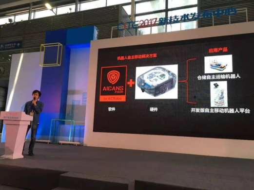 CEO佘元博向觀眾介紹AICRobo的核心解決方案 演講會(huì)后,不少記者紛紛來到愛啃蘿卜機(jī)器人公司的展位現(xiàn)場(chǎng)開展進(jìn)一步的采訪。同時(shí),眾多研究所的主任及代表也表示對(duì)AICRobo公司的機(jī)器人自主移動(dòng)解決方案興趣盎然。