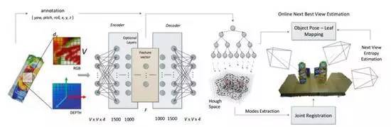 這個工作大概是這樣的:對于一個物體,取很多小塊RGB-D數(shù)據(jù);每小塊有一個坐標(相對于物體坐標系);然后,首先用一個自編碼器對數(shù)據(jù)進行降維;之后,用將降維后的特征用于訓練Hough Forest。