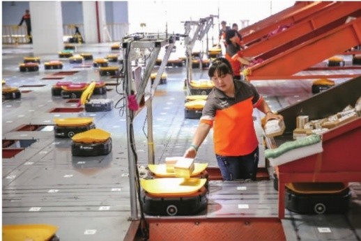 5月3日,放件員將包裹放在機(jī)器人的托盤上。義烏申通公司的快遞智能機(jī)器人分揀系統(tǒng)工作著700多個快遞機(jī)器人,它們外觀近似掃地機(jī)器人,頂部有一個活動托盤用來運(yùn)載包裹。其分揀錯誤率低,...