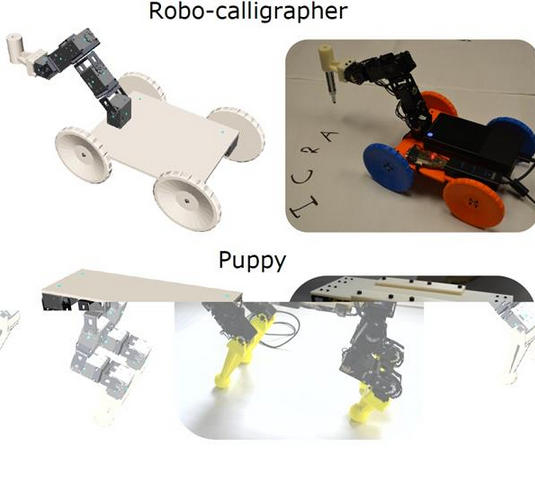 研究團隊用這個工具嘗試構(gòu)建了一些不同的步行和輪式機器人。其中一個輪式機器人帶有一個機械臂,可以握住一支鋼筆來畫畫;另一個機器人類似一條四條腿的小狗,可以向前走或側(cè)著走。