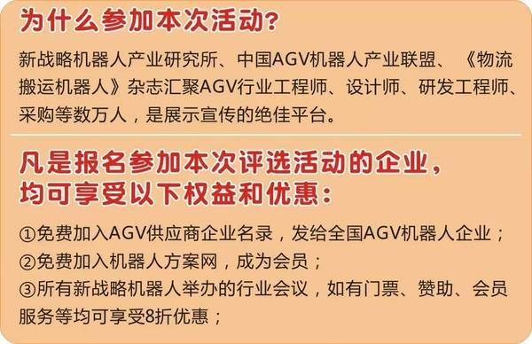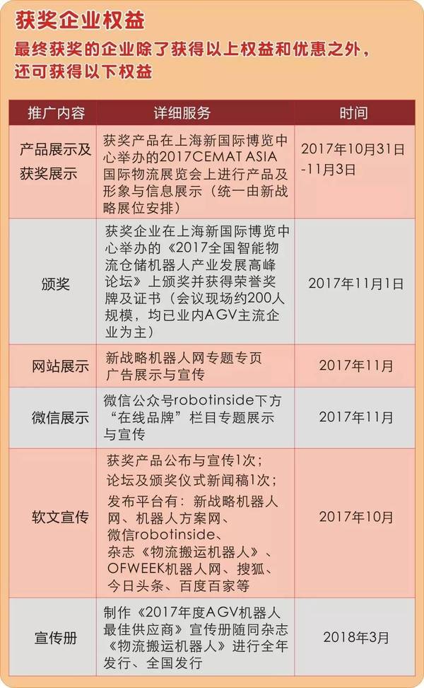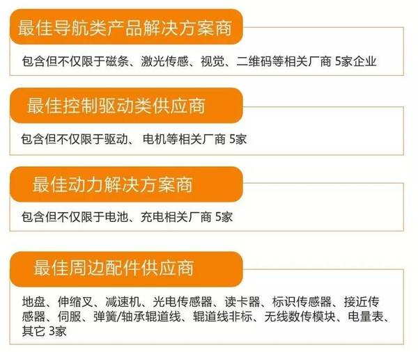 2017年AGV行業(yè)最佳供應(yīng)商評選涉及材料供應(yīng)商,核心配件、解決方案的相關(guān)廠商及模具制造商,通過設(shè)置各細分領(lǐng)域的最佳供應(yīng)商,全面尋找AGV行業(yè)各細分領(lǐng)域龍頭及杰出貢獻者,并藉此幫助AGV機器人本體品牌商尋找優(yōu)質(zhì)供應(yīng)商。
