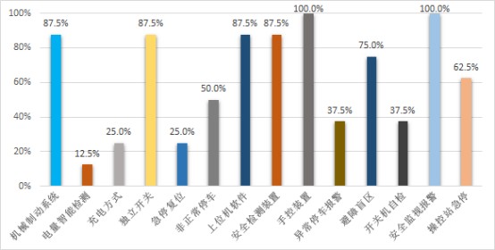 (2) 安全裝置方面,所有產(chǎn)品未配備專用合格的手控裝置,并在超速、超載等異常狀態(tài)時無閃爍燈和聲音報警功能;87.5%的產(chǎn)品存在障礙物安全檢測盲區(qū),且未采用機械制動系統(tǒng),安全風險較高。